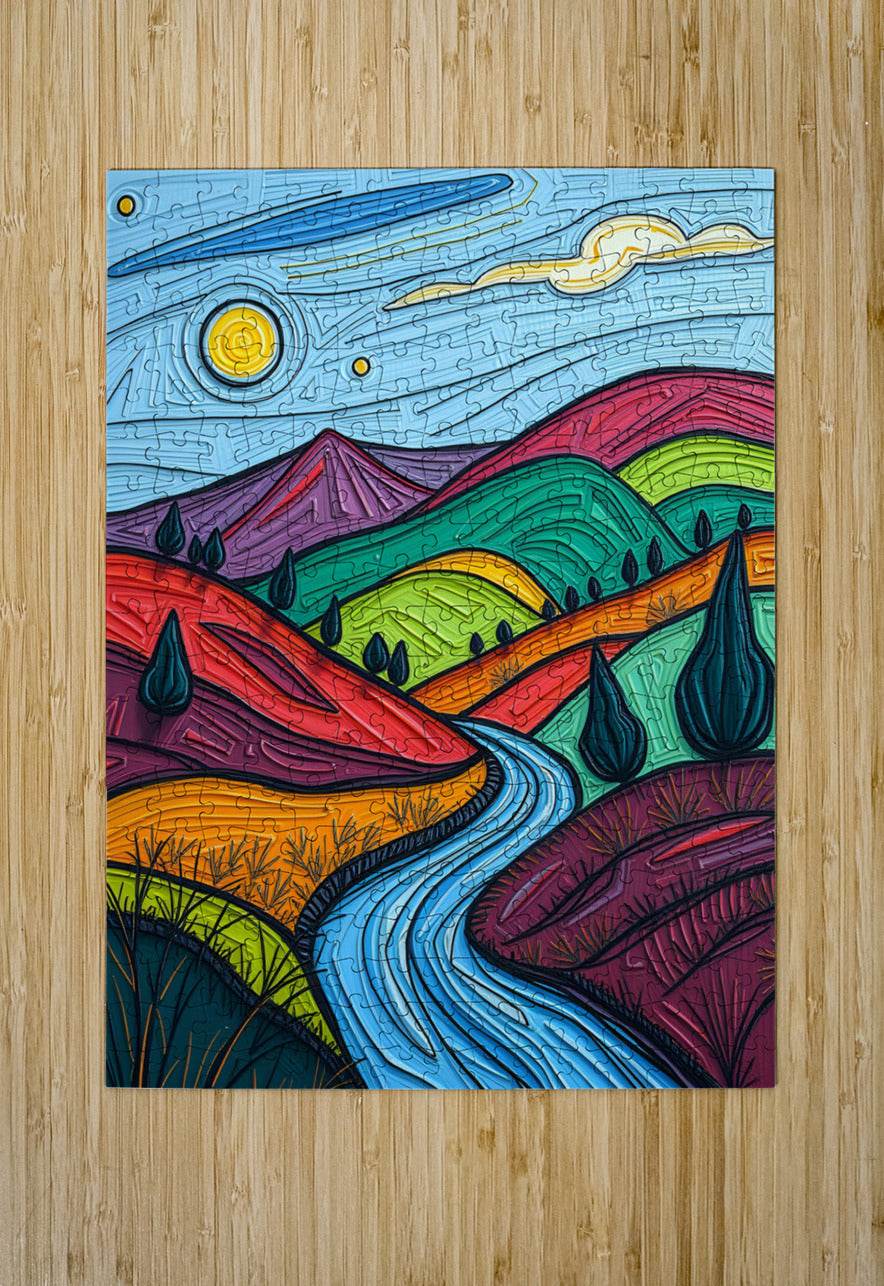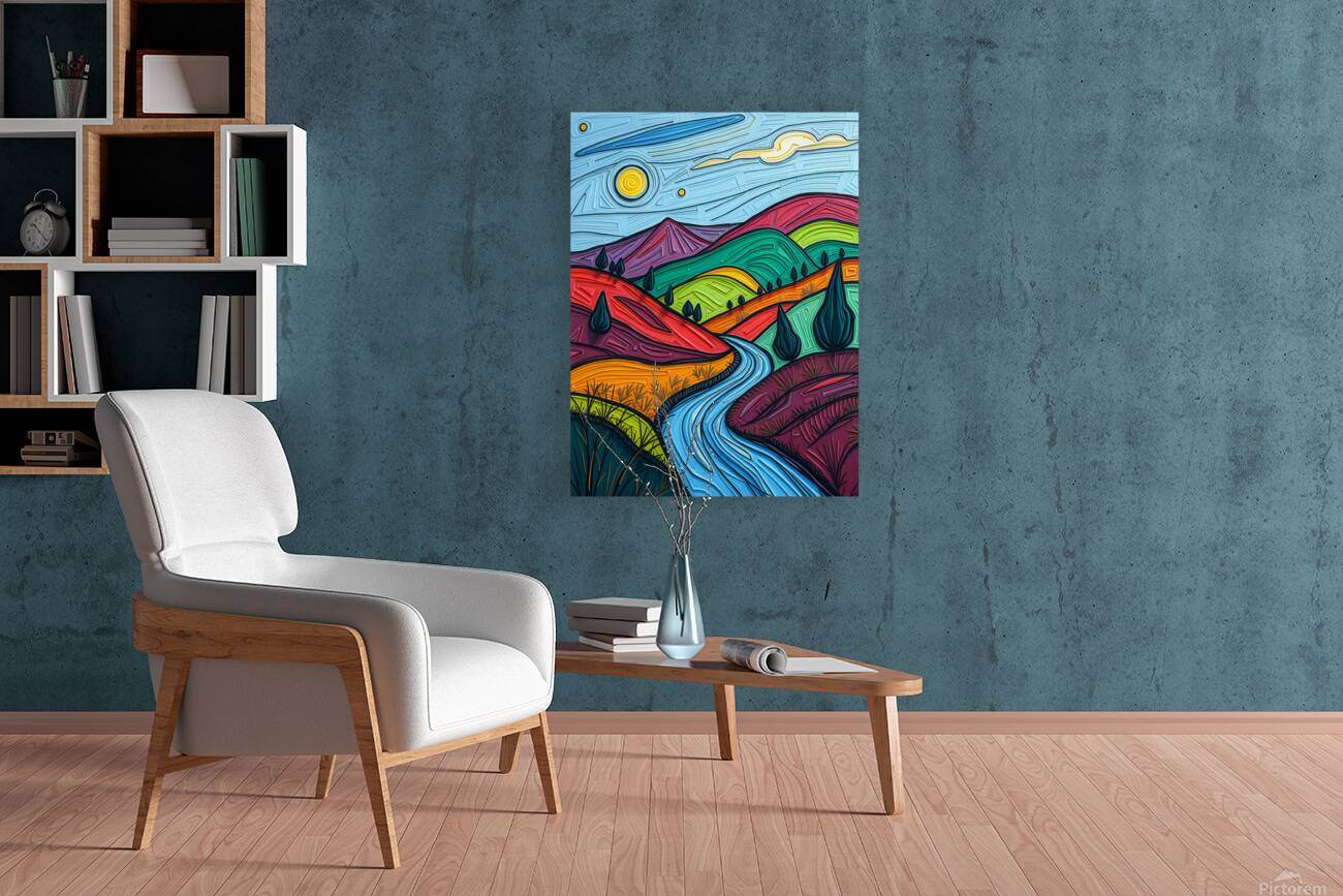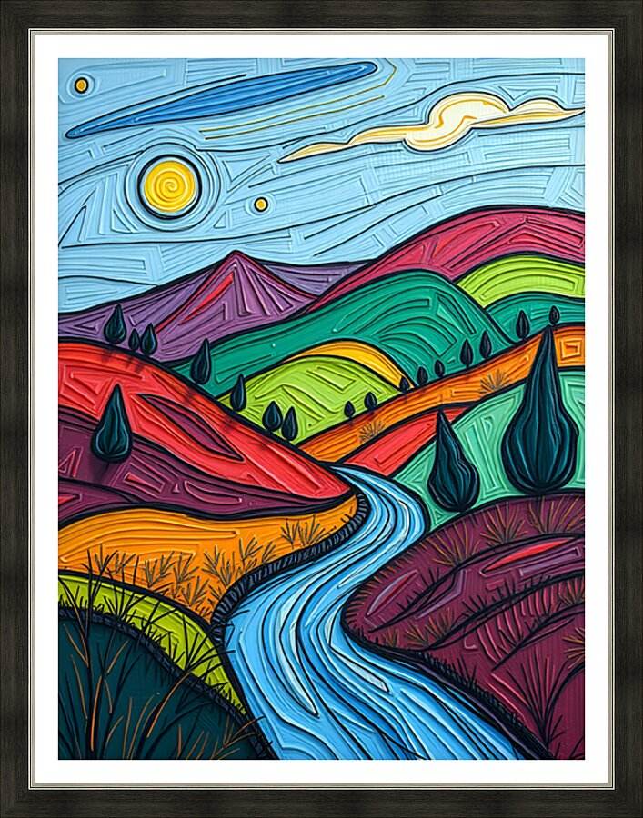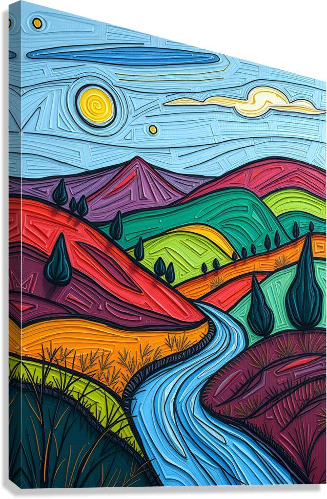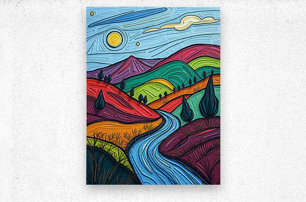 The artwork employs dimensional relief rendering to create sculptural depth through layered contour lines, suggesting carved or embossed surfaces. The color palette utilizes high-contrast combinations—vibrant teals against hot pinks, lime greens against deep purples—creating visual energy and movement. The sky features organic swirling patterns with a golden spiral sun as focal point, while flowing forms suggest clouds or atmospheric energy. A winding blue river creates strong compositional flow through the center, bordered by rolling hills rendered in alternating warm and cool tones. Stylized cypress trees in dark teal provide vertical elements and scale. Directional line work within each colored field creates textural richness and suggests natural terrain contours. The composition successfully balances dynamic movement with structural organization.