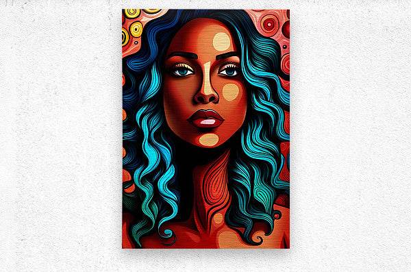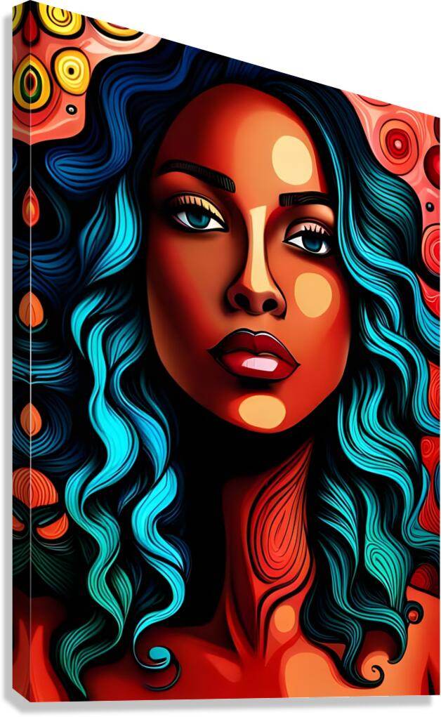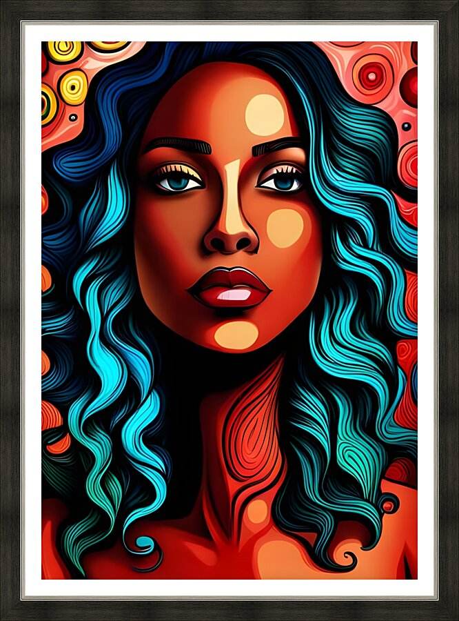 Immerse yourself in the bold world of Blart13 - Contemporary-Pop-Art-Vibrant-Psychedelic. This striking Contemporary Pop Art masterpiece features a captivating female portrait with flowing turquoise hair and mesmerizing blue eyes. The face is rendered in warm orange and red tones with decorative circular patterns, set against a dynamic psychedelic background of swirling reds, oranges, and yellows that creates an explosion of color and energy.
