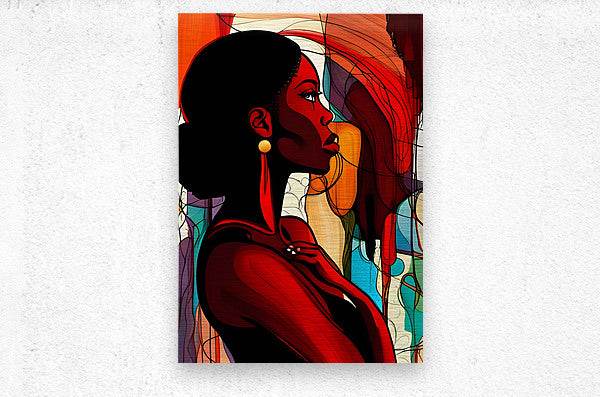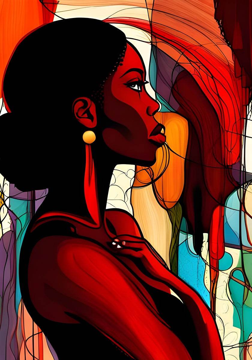 Meet the mesmerizing Blart20 - Contemporary-Portrait-Vibrant-Expressive. This stunning artwork features a captivating contemporary portrait of a woman with elegant black hair and golden earrings, set against a dynamic multicolored background with bold geometric elements. The expressive composition combines rich reds, vibrant oranges, deep blues, and purple accents that create a powerful emotional connection.