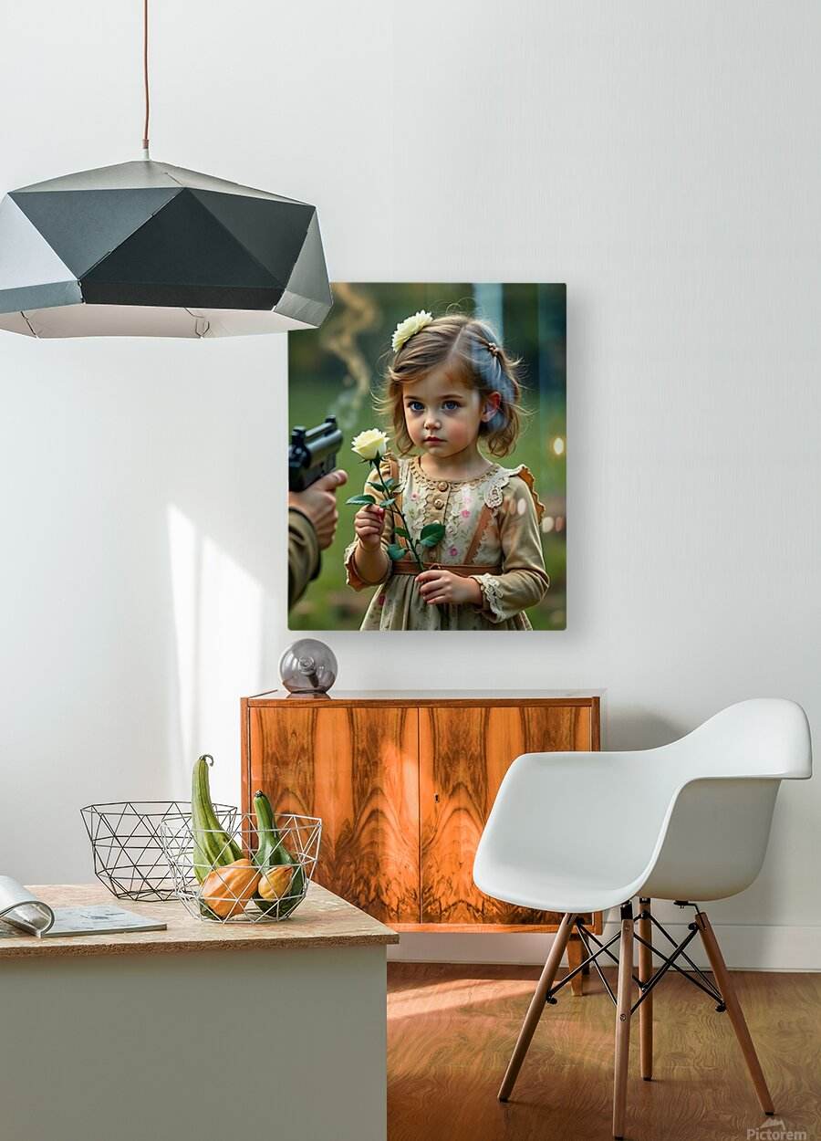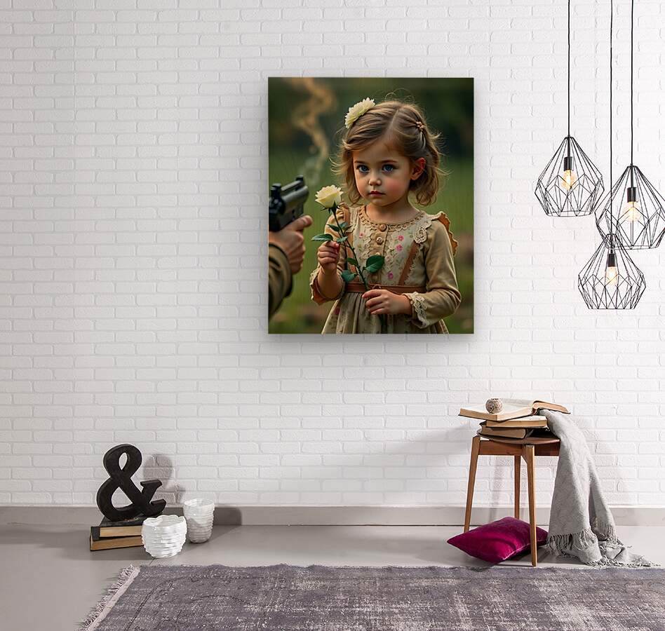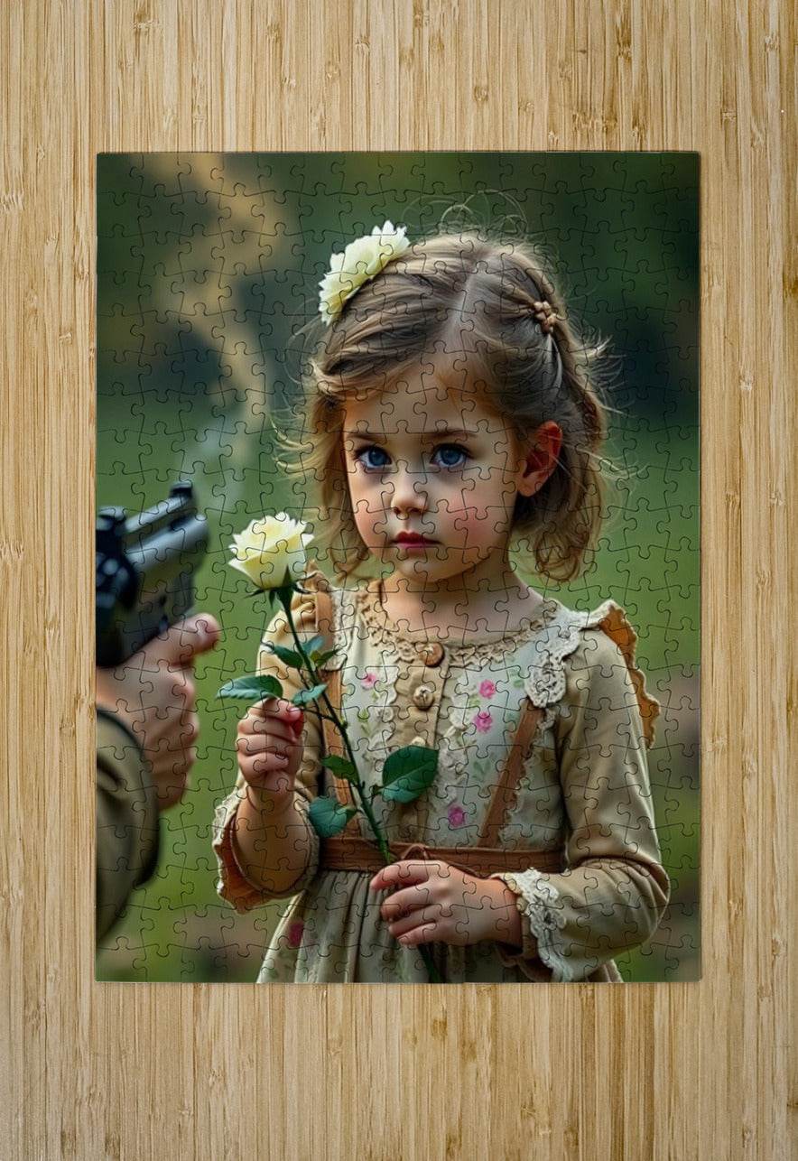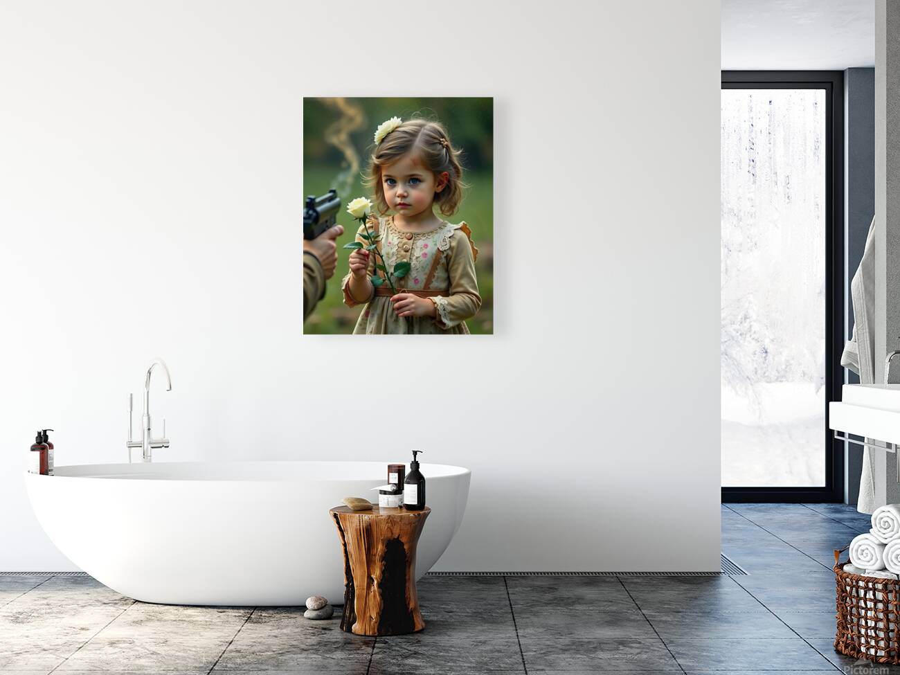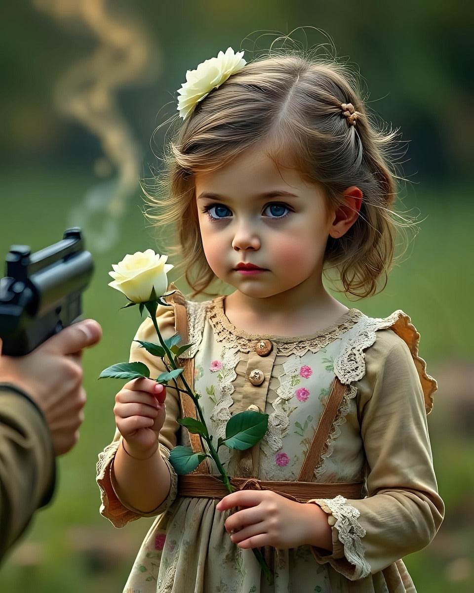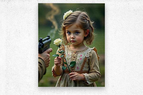 Experience the powerful message of Stop The War 5 - Peaceful-Protest-Powerful. This emotionally striking artwork features an innocent young girl holding a white rose as a symbol of peace, creating a profound statement against violence. A moving piece that speaks to the heart about the importance of protecting innocence and choosing peace over conflict.