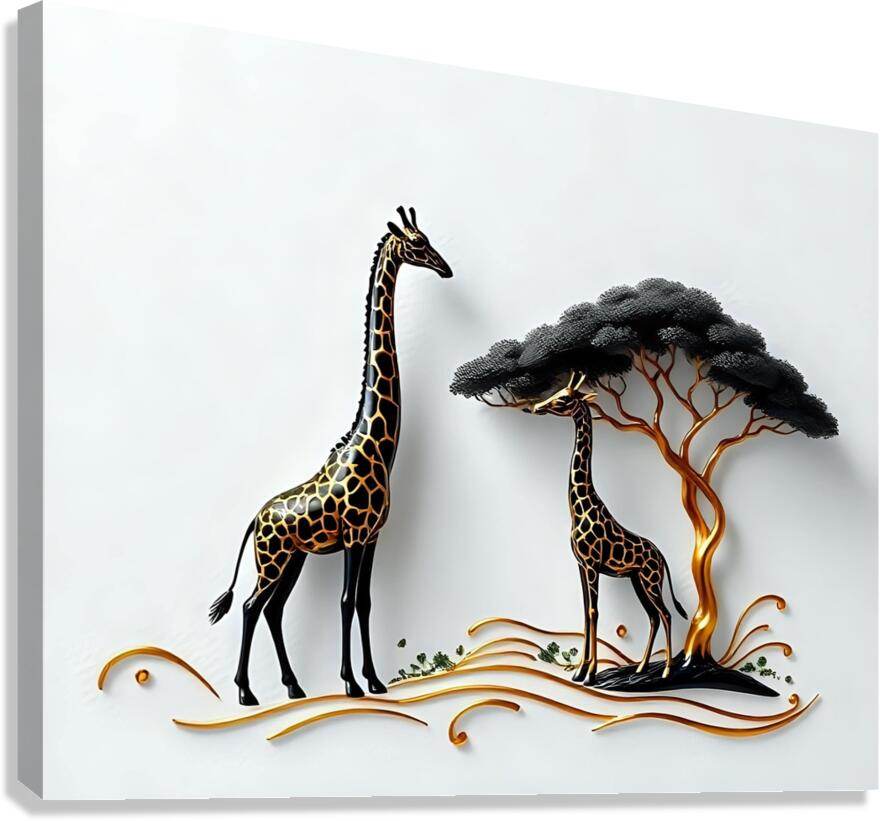 This is Africa reimagined through the lens of sculptural art. The giraffes' elegant forms are rendered in rich amber and black, their distinctive patterns creating visual music across their bodies. Behind them, the iconic acacia spreads its umbrella canopy in textured black, its trunk flowing in golden-brown tones that seem to glow with inner warmth. Below, decorative golden swirls dance across the ground like wind-swept grasses or the very spirit of the savanna made visible.