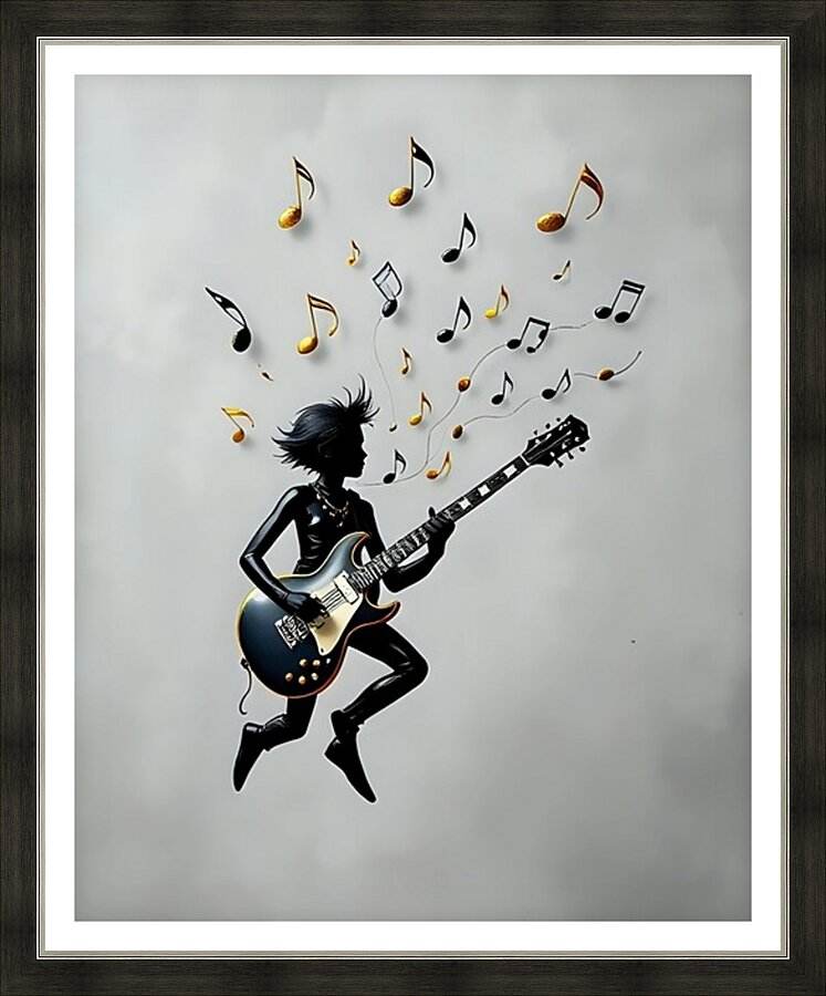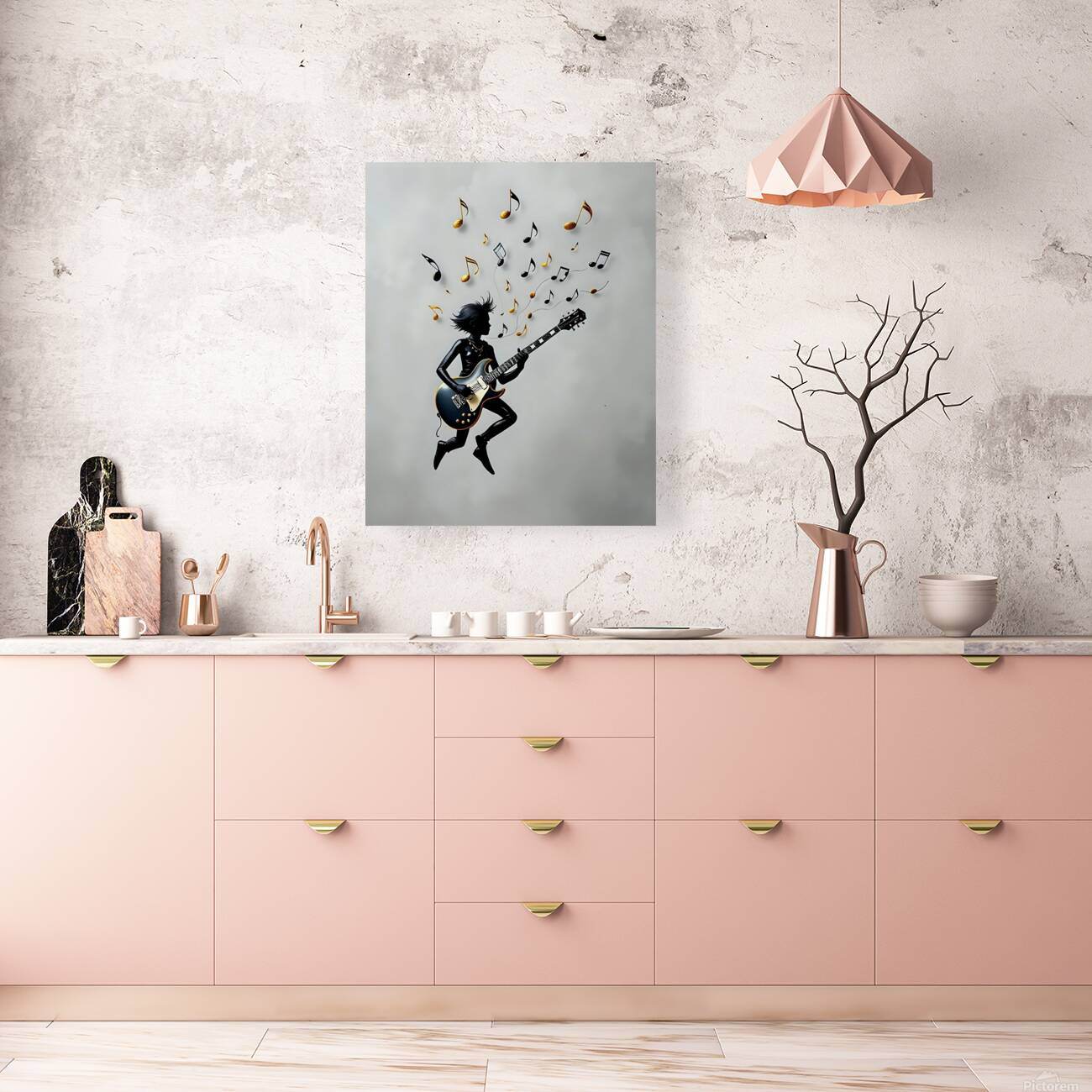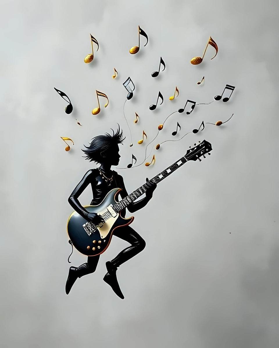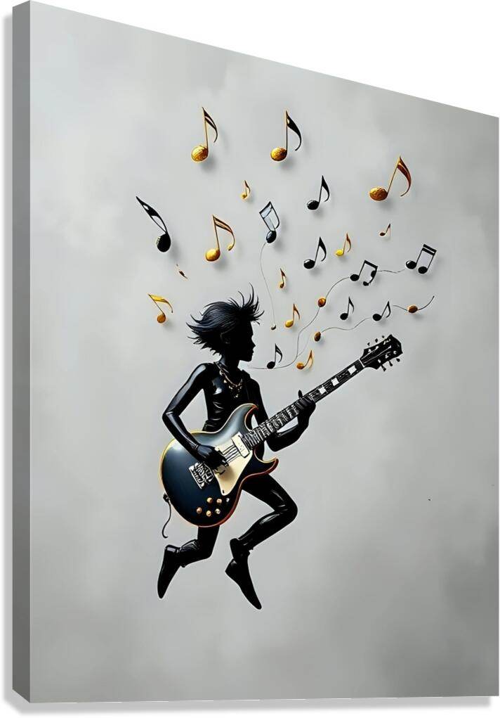 Experience the dynamic silhouette of a guitarist in 'Stylized Art 19'. This piece captures the energy of music and the dinamism of notes in a unique, artistic way. Perfect for music lovers and art enthusiasts alike.