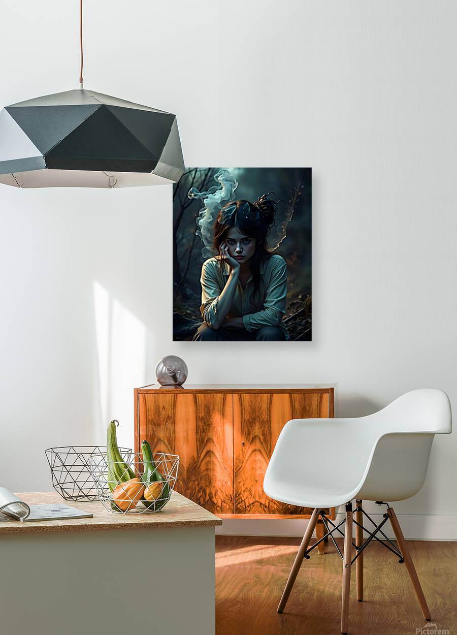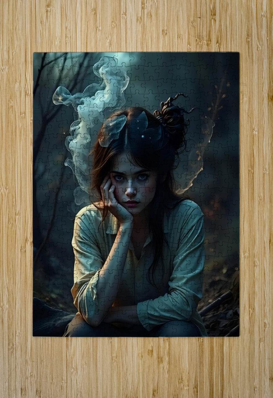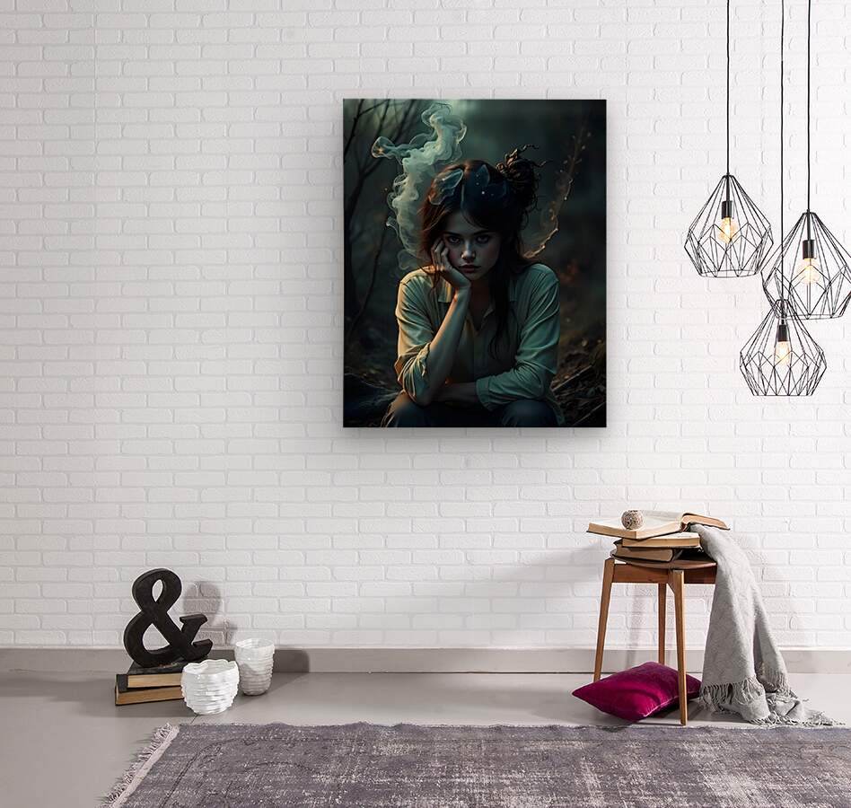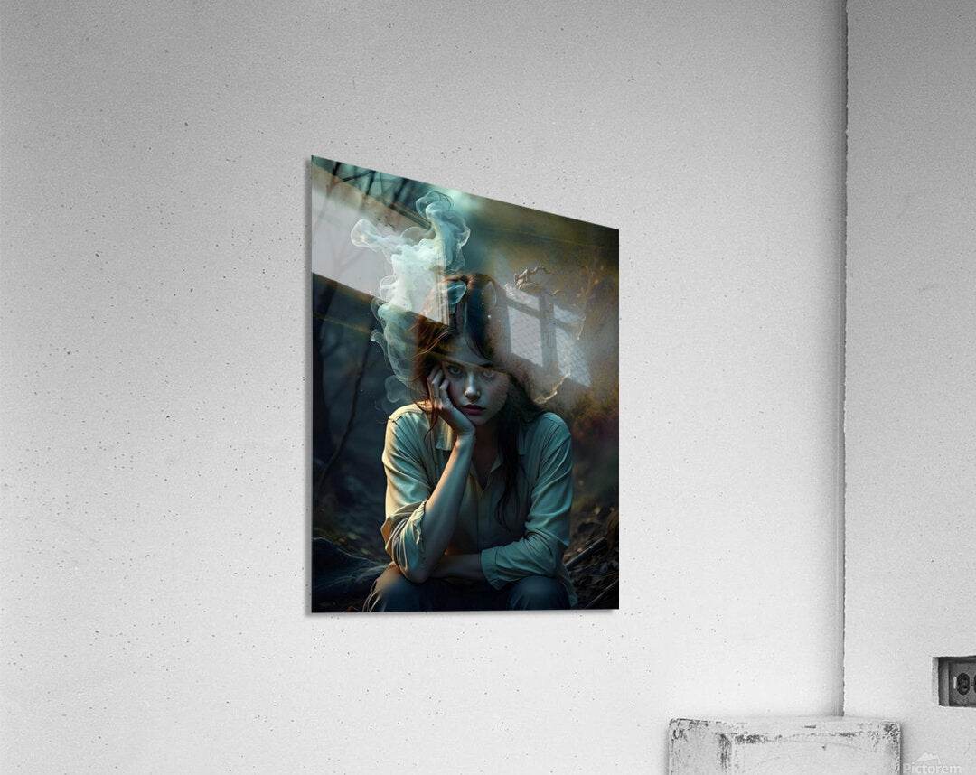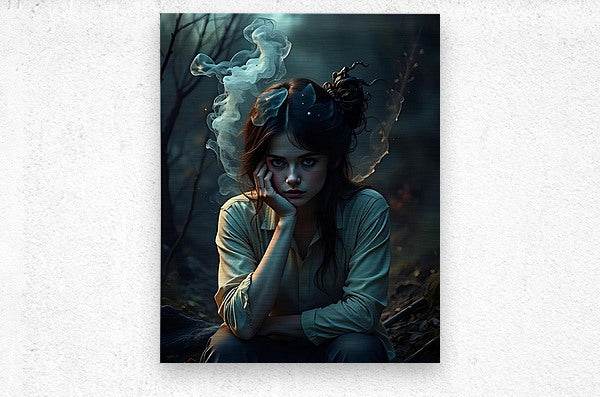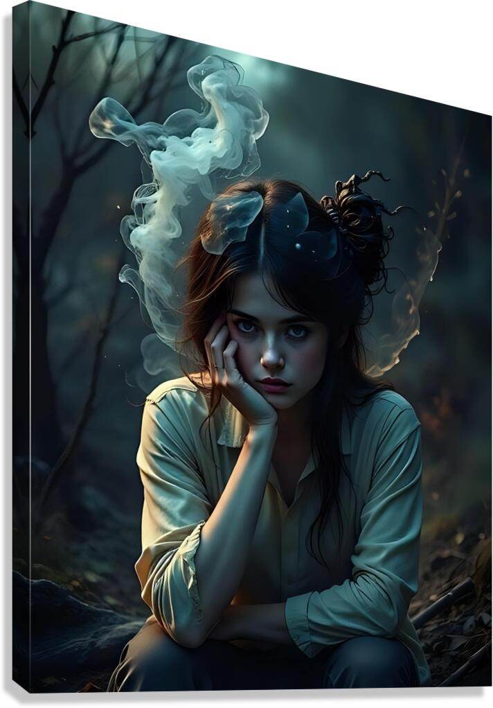 The artwork employs photorealistic portrait rendering enhanced with surreal atmospheric elements. The subject's contemplative pose—hand to face, direct gaze—creates psychological engagement while suggesting introspection. Ethereal smoke wisps emerge from the head area, symbolizing thoughts, dreams, or consciousness made visible. The color palette utilizes cool teal-green tones for atmospheric mood, contrasted with warm golden highlights on skin and clothing. Dramatic lighting emphasizes facial structure and creates dimensional depth. Background elements including bare branches and soft-focus forest setting add mystical context without competing with the central figure. The composition successfully bridges realism and surrealism, creating visual metaphor for inner experience.