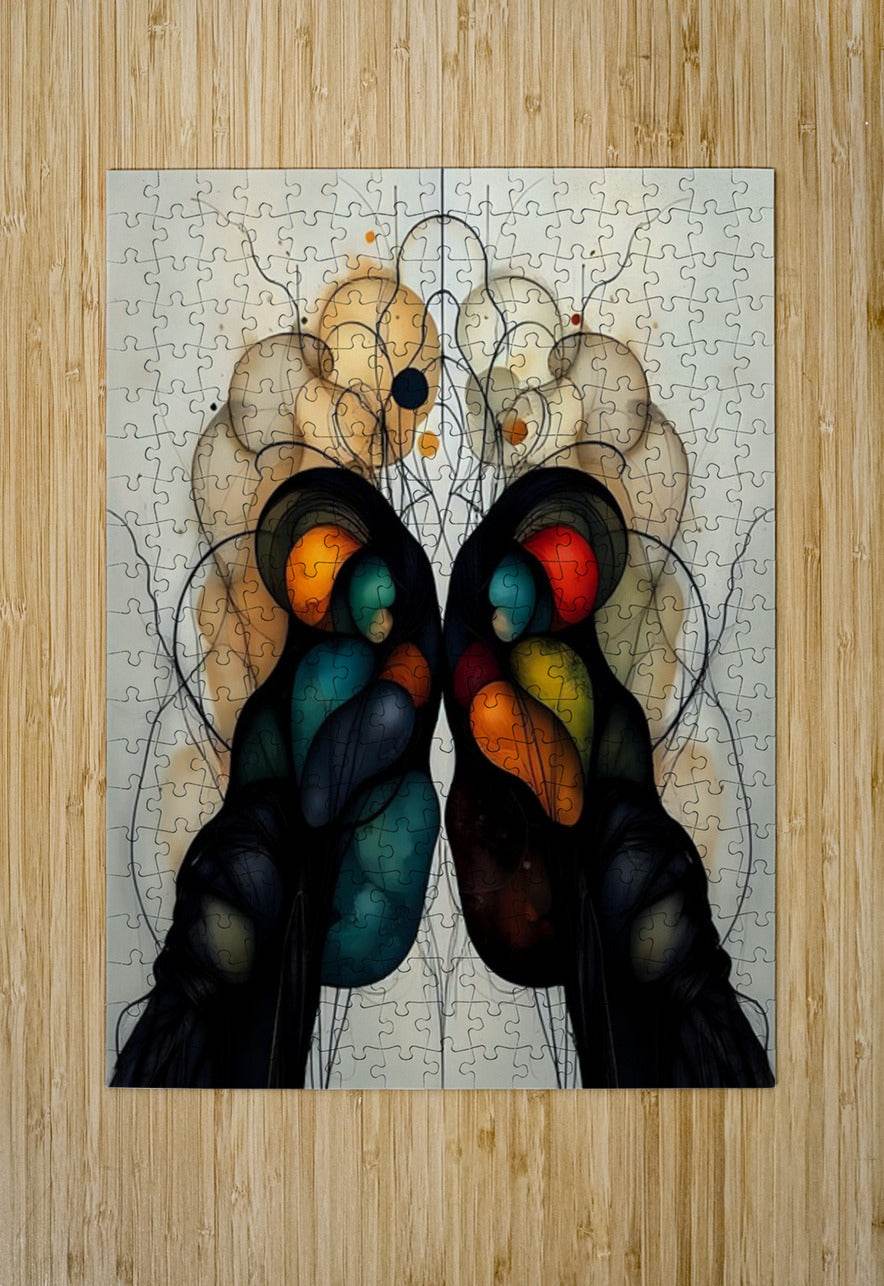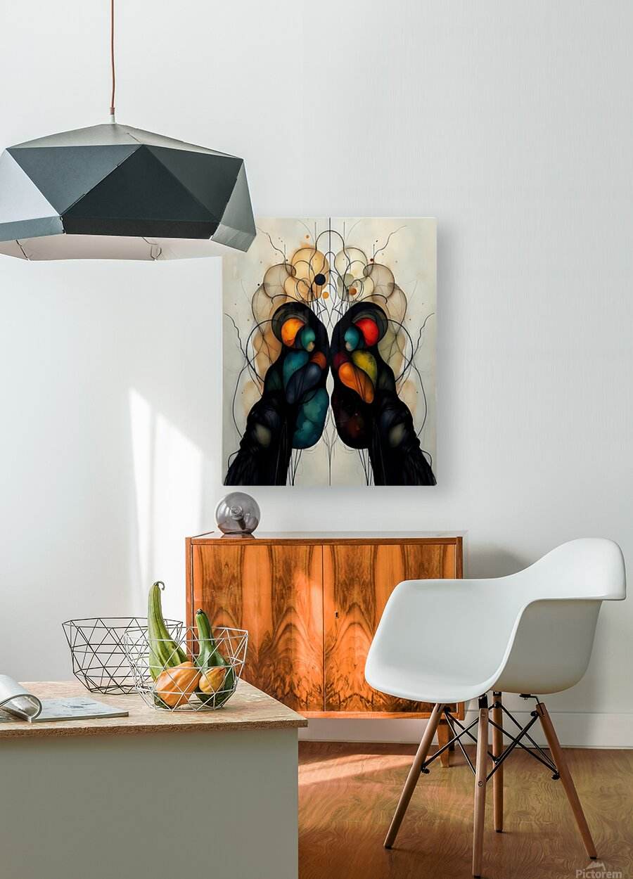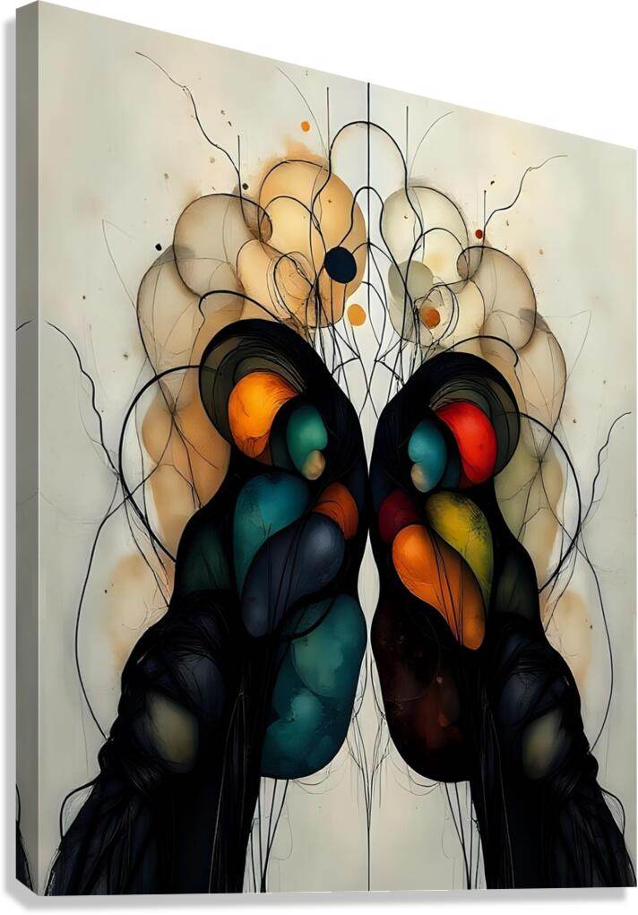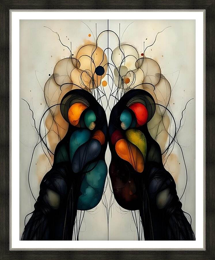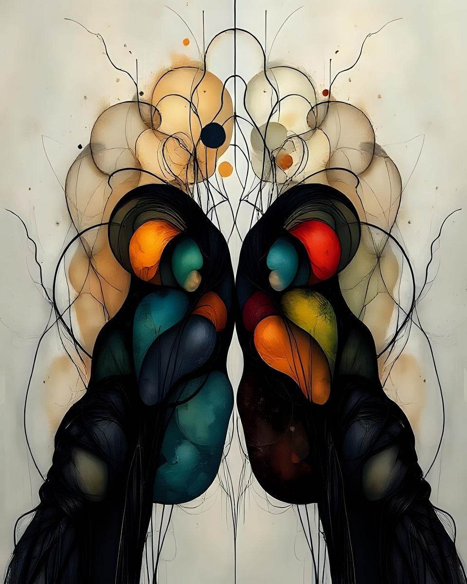 Two figures emerge from darkness, their forms a meditation on duality and unity. Symmetrical Art 24 speaks in the language of dreams—where organic shapes bloom like thoughts, where colorful orbs glow like memories, and where perfect symmetry becomes a mirror reflecting the soul's hidden depths.