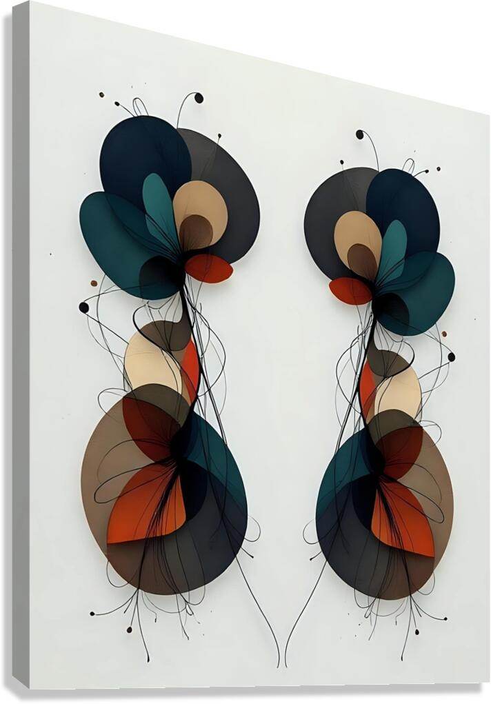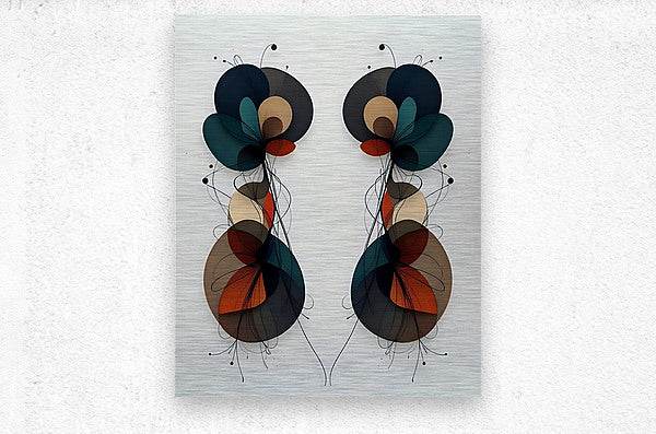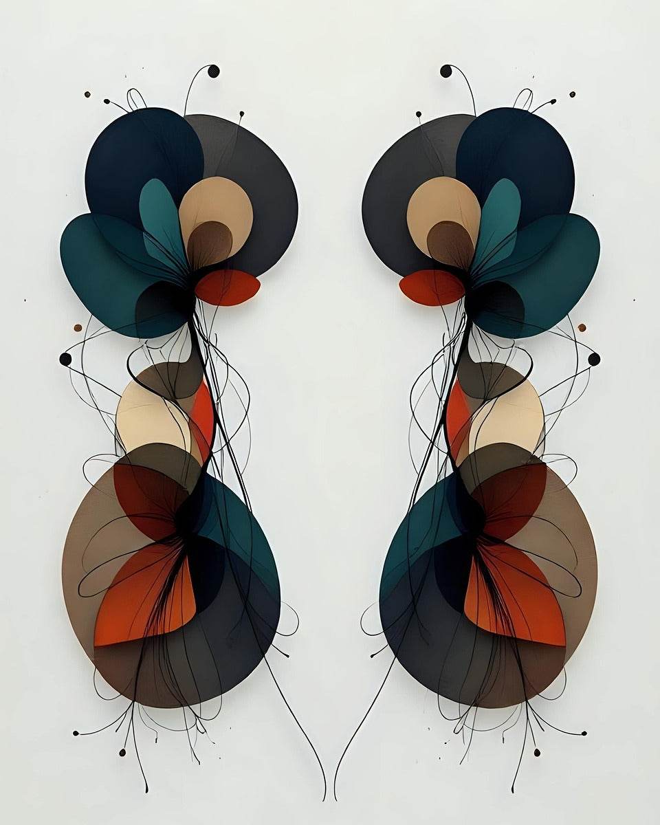 The story begins at the top with navy and teal circles, like seeds or beginnings. As your eye travels downward, shapes multiply and overlap—beige, brown, orange, deep teal—creating depth through transparency. Delicate linear elements connect the forms like stems or thoughts, grounding the composition while allowing it to float in contemplative space.