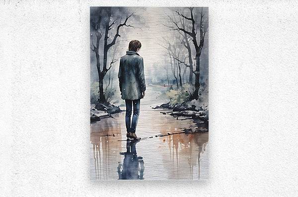 Journey into solitude with The One Alone - Contemporary-Watercolor-Contemplative-Melancholic. This deeply moving Contemporary Watercolor artwork captures a solitary figure in a blue coat walking along a forest path, their reflection mirrored in the water-covered ground. The delicate watercolor technique creates a dreamlike atmosphere with soft blues, grays, and warm earth tones, evoking feelings of introspection, solitude, and quiet contemplation.