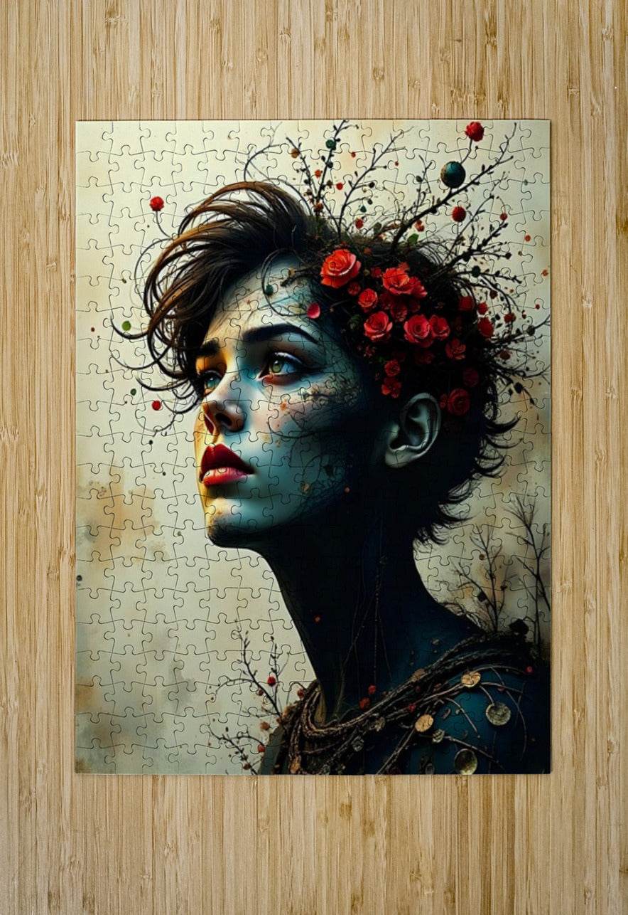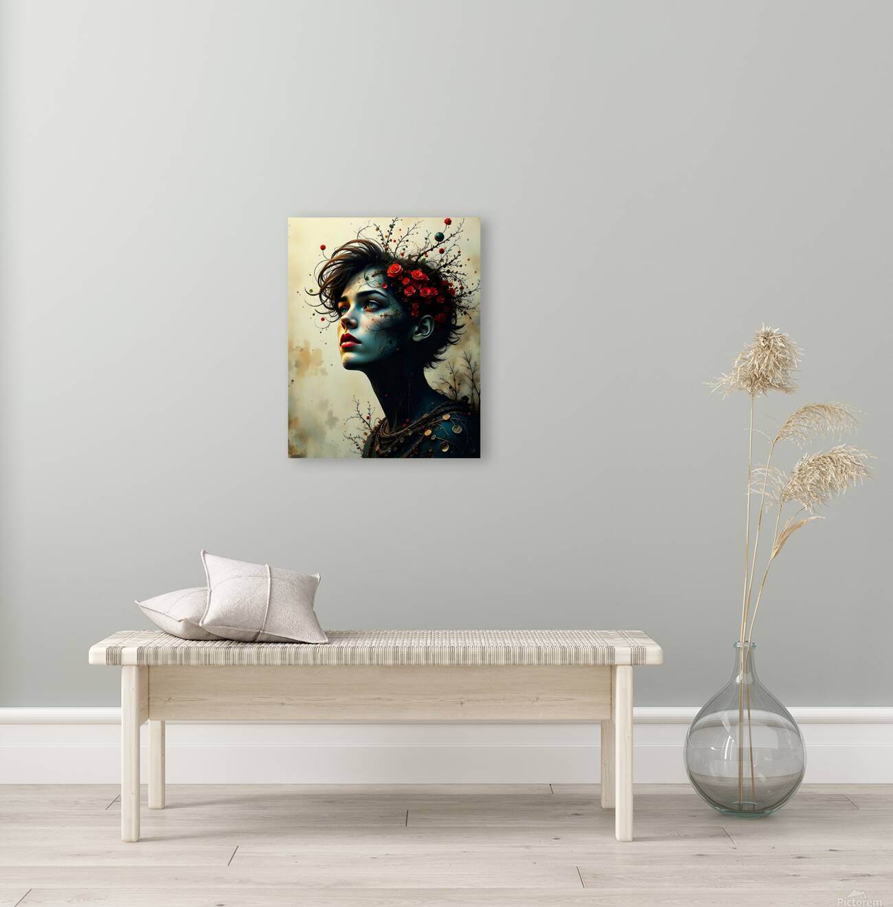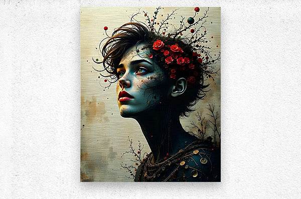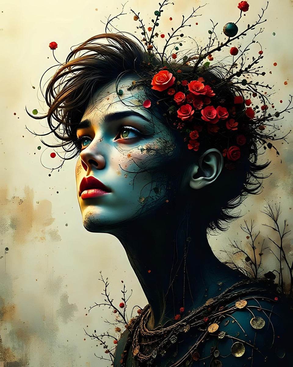 Enter the dramatic world of Thoughts 26 - Gothic-Romantic-Theatrical. This stunning artwork features a powerful feminine figure adorned with vibrant red roses and theatrical makeup, surrounded by organic branches and dramatic shadows. A perfect blend of gothic romance and theatrical artistry.