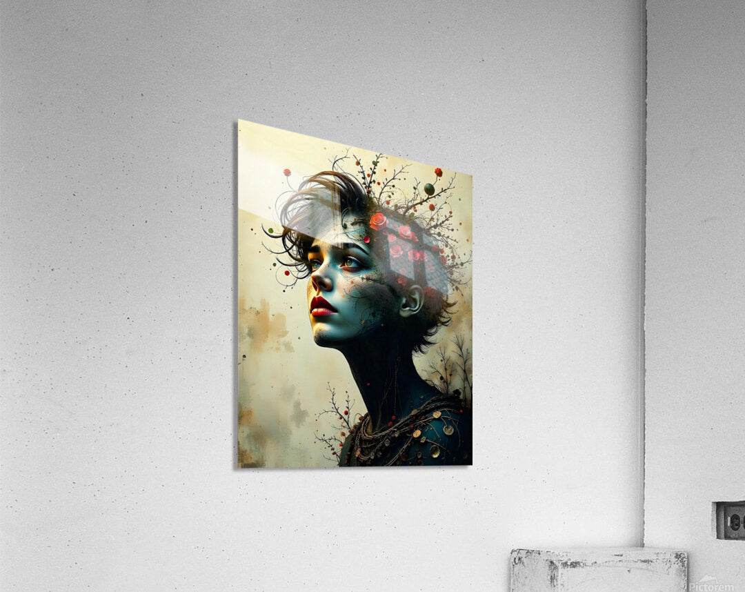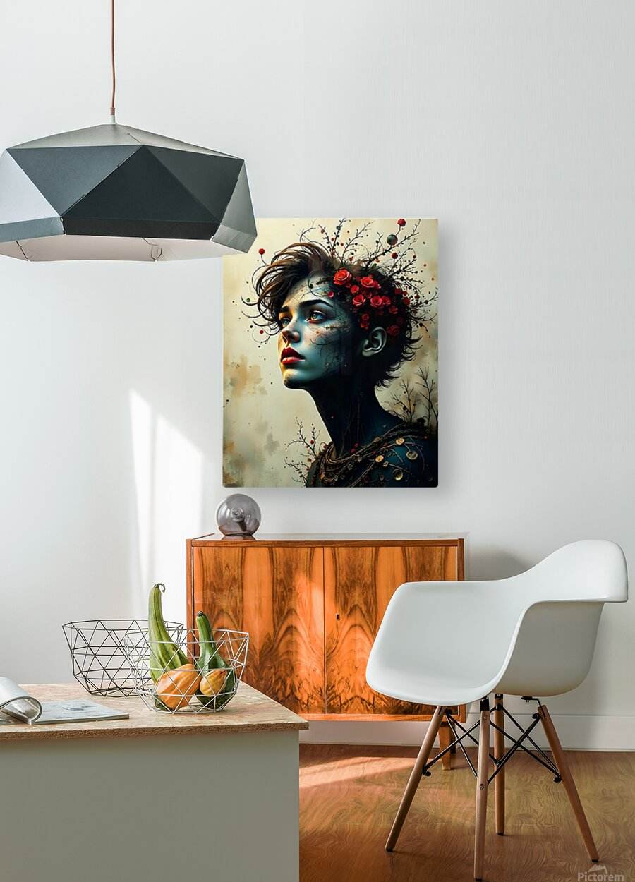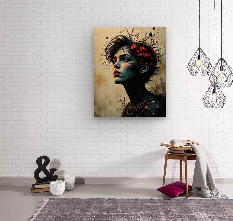 Enter the dramatic world of Thoughts 26 - Gothic-Romantic-Theatrical. This stunning artwork features a powerful feminine figure adorned with vibrant red roses and theatrical makeup, surrounded by organic branches and dramatic shadows. A perfect blend of gothic romance and theatrical artistry.