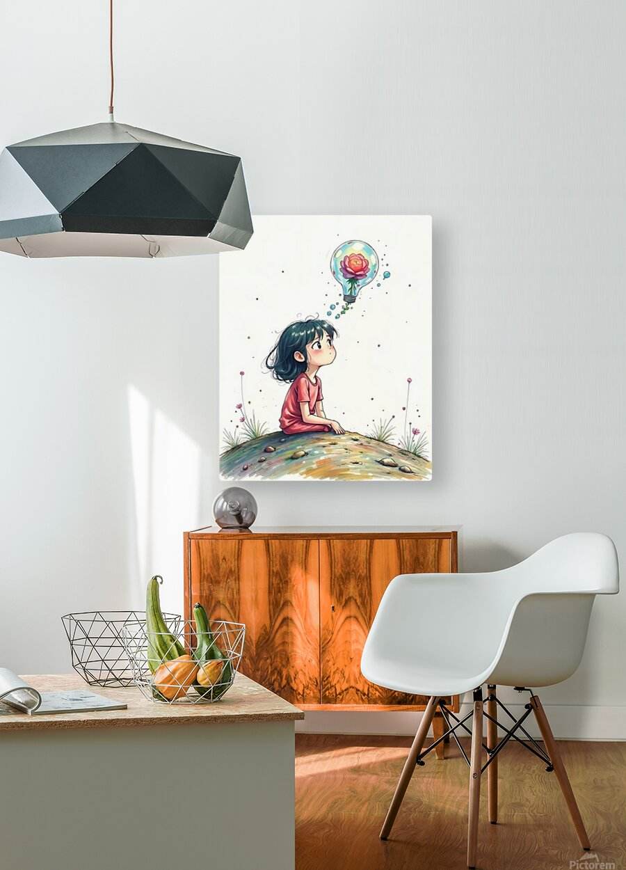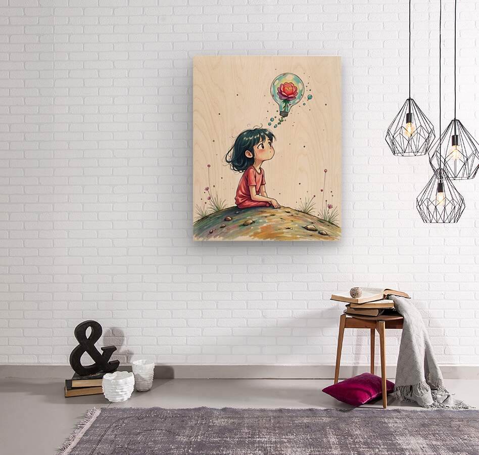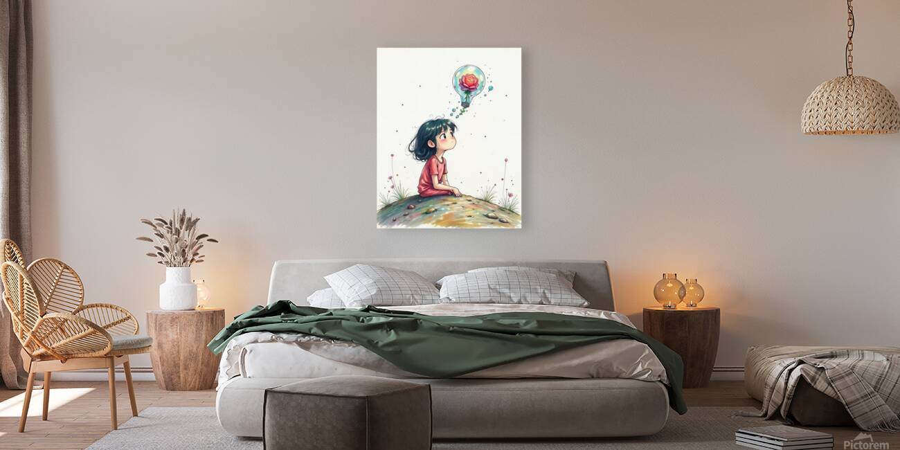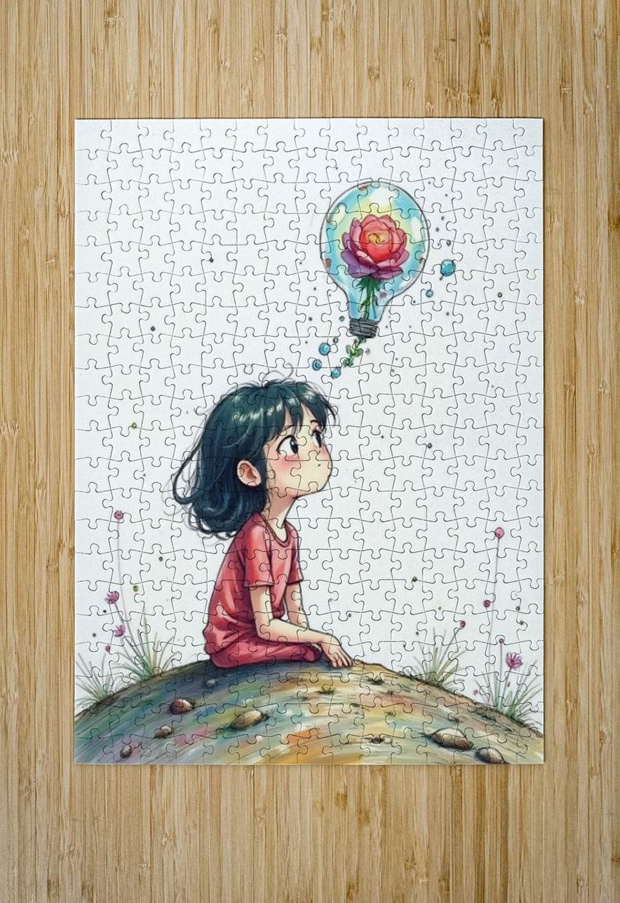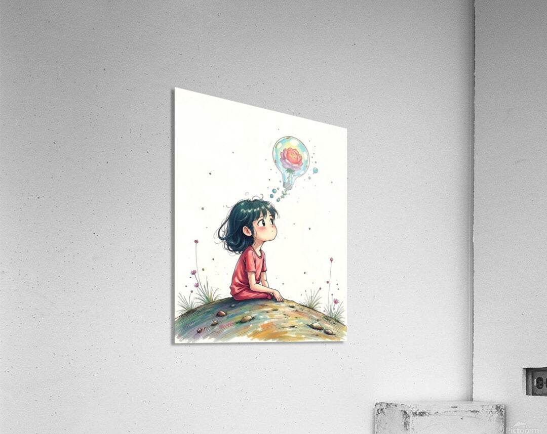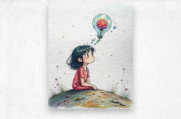 Discover the magical world of Thoughts 31 - Whimsical-Inspirational-Dreamy. This enchanting artwork features a sweet young girl sitting on a small planet, gazing up at a magical light bulb containing a beautiful rose. A perfect representation of creativity, dreams, and the power of imagination to bloom into beautiful ideas.