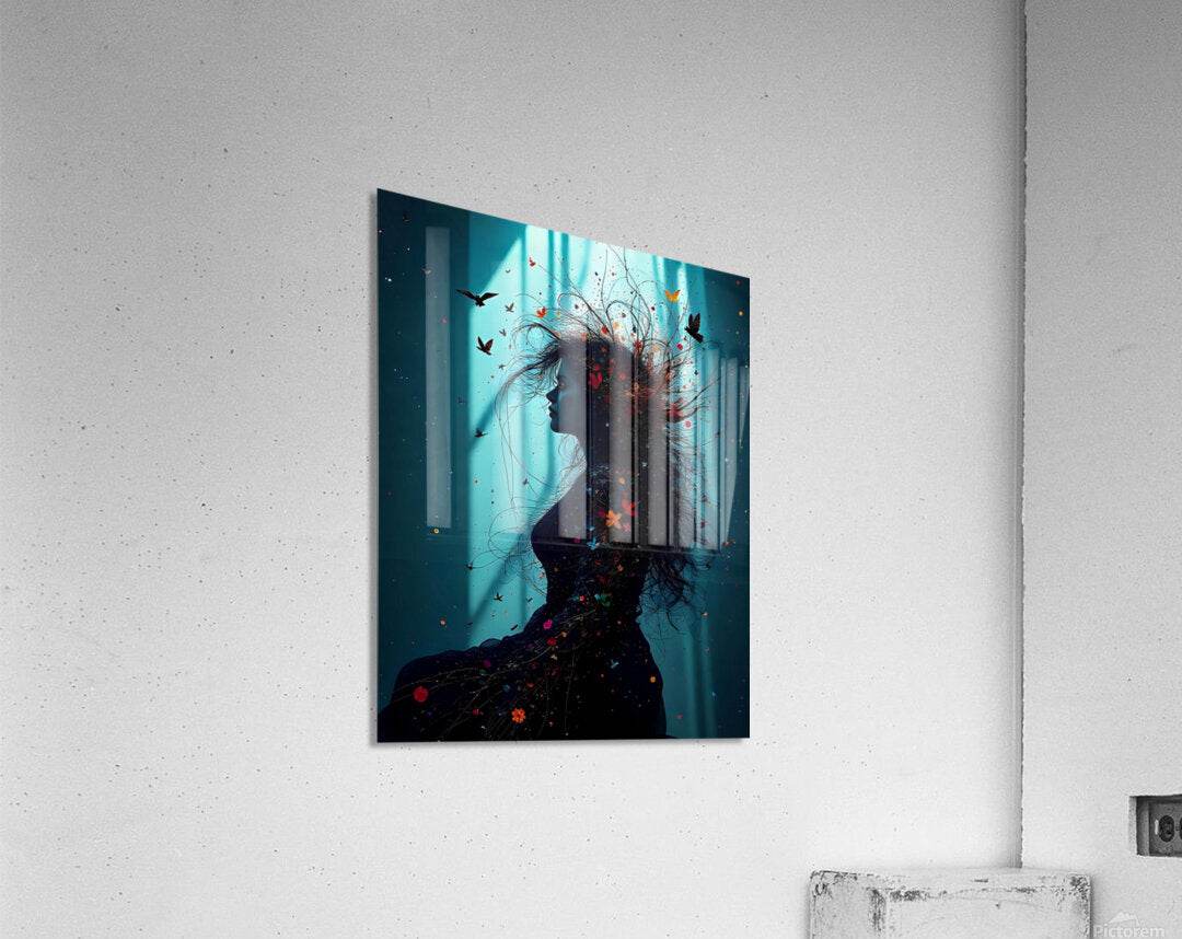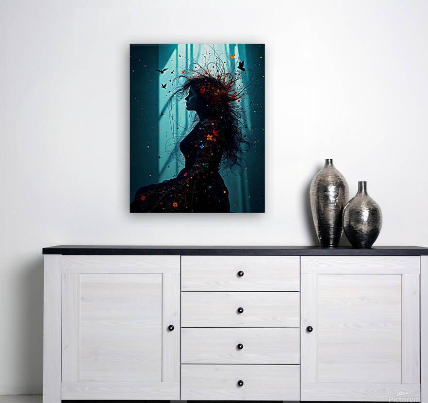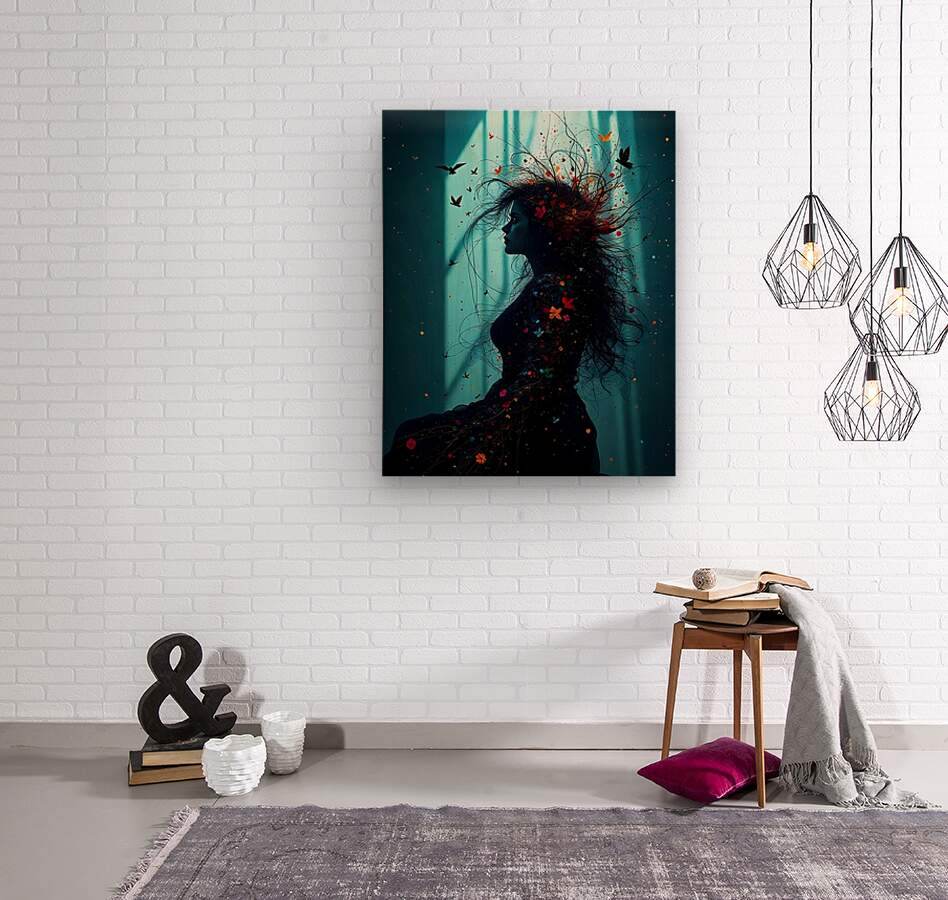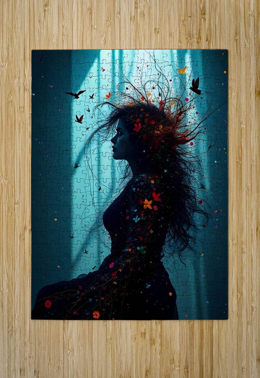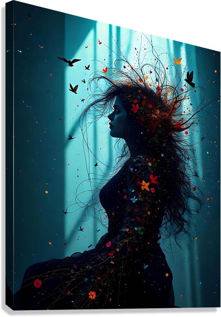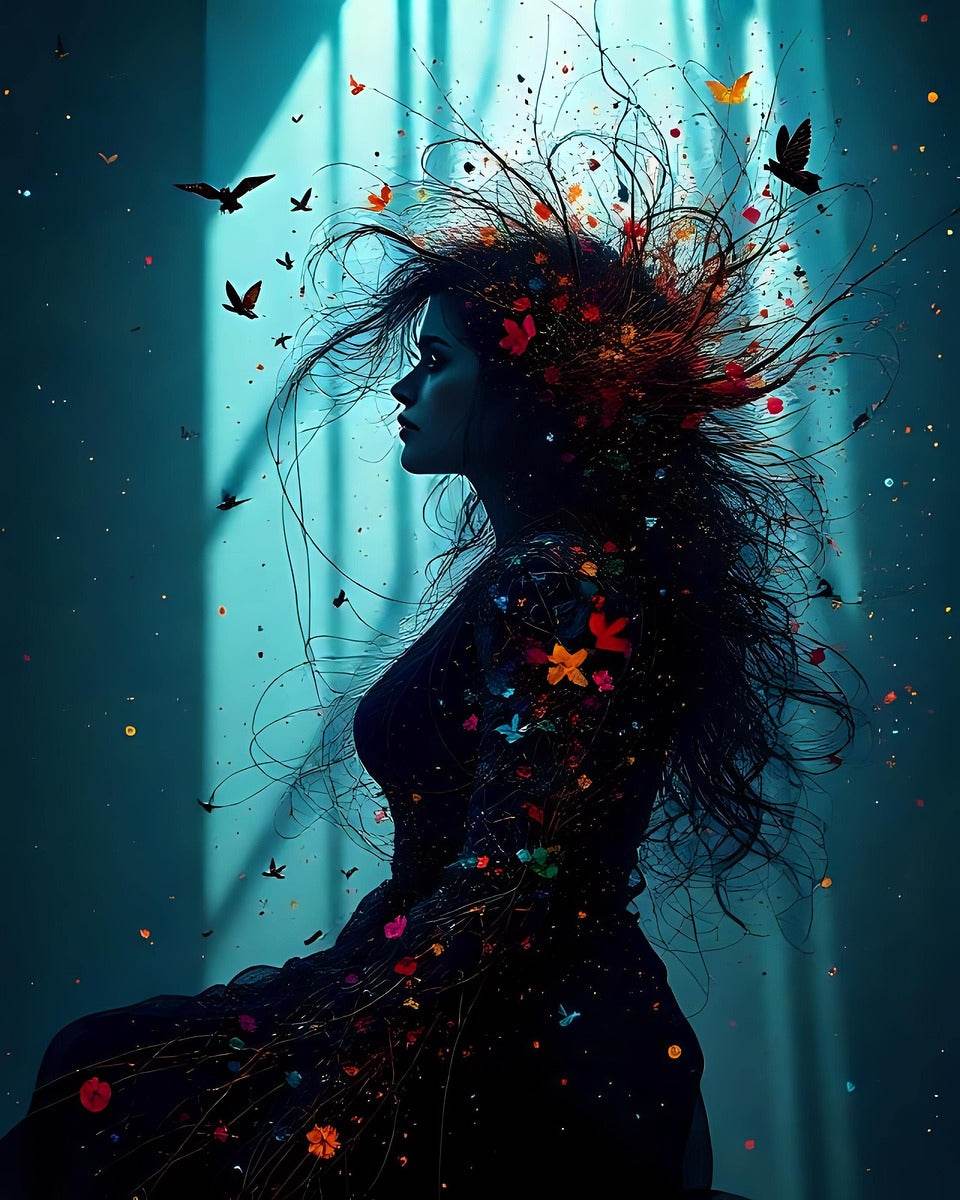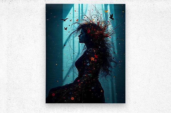 Discover the mystical beauty of Thoughts Unbound 15 - Mystical-Spiritual-Transcendent. This enchanting artwork features a feminine silhouette with birds and flowers flowing from her hair, symbolizing the liberation of thoughts and spiritual transcendence. Perfect for meditation spaces and spiritual art lovers.
