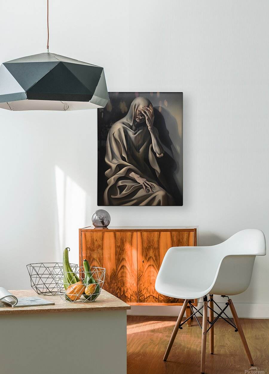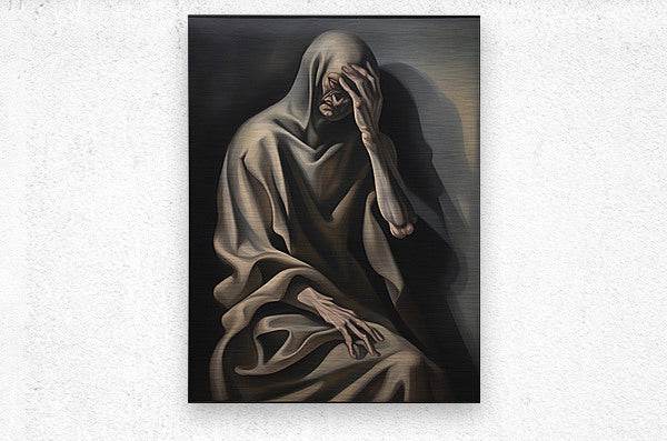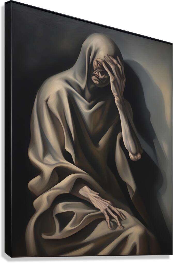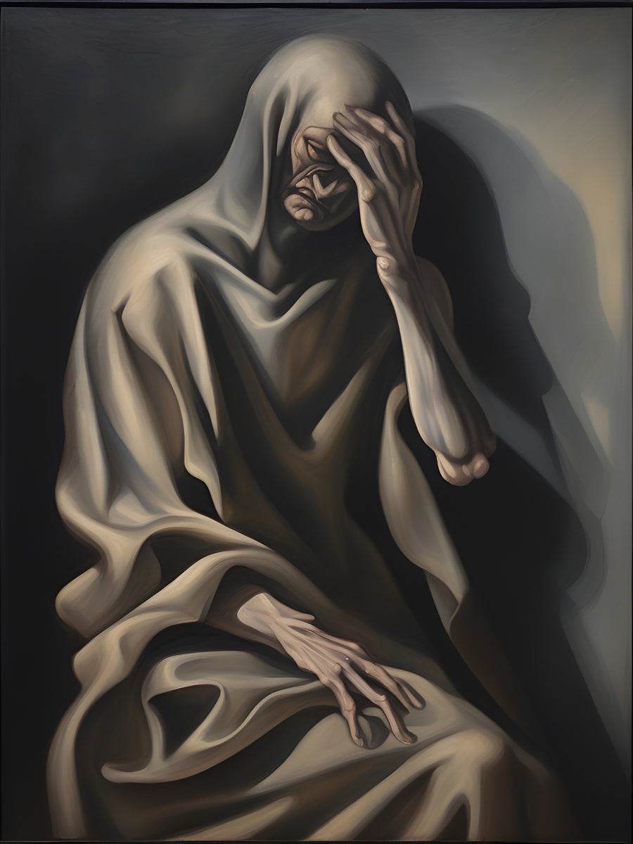 In the depths of shadow, a figure sits wrapped in flowing robes, hand pressed to face in a gesture of profound contemplation. Veil Of Distortion 4 captures the weight of human emotion through dramatic digital artistry—where fabric flows like liquid stone, where light and shadow create sculptural depth, where every fold tells a story of vulnerability, introspection, and the beautiful complexity of feeling deeply.