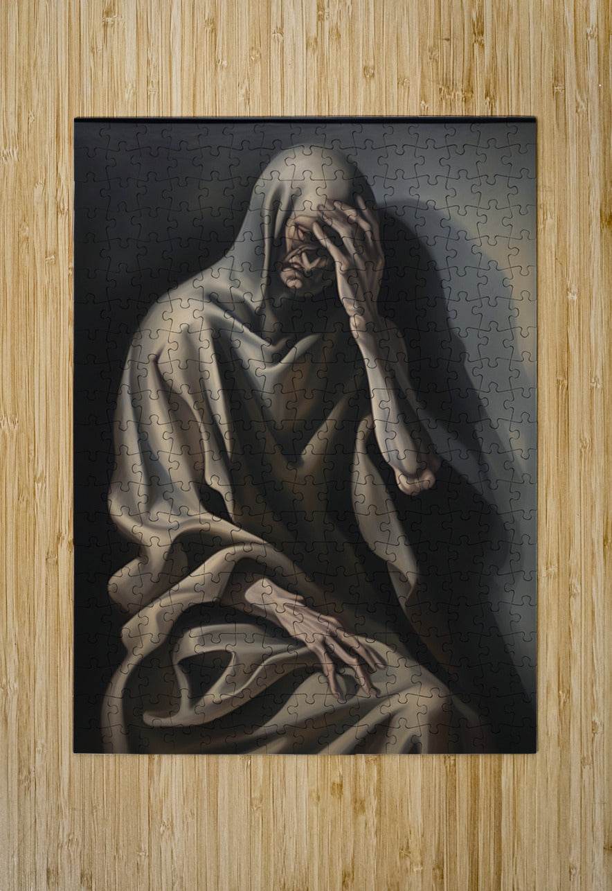 The narrative unfolds in shades of grey and shadow: the figure's pose speaks volumes—seated, bent forward, hand covering the face in a universal gesture of grief, worry, or deep thought. The robes cascade in magnificent folds, each one rendered with such precision that you can almost feel the weight of the fabric, the texture of the cloth. The monochromatic palette—ranging from pale grey to deep charcoal—creates a timeless quality, as if this moment of contemplation exists outside of time, in a space where emotion is the only reality.