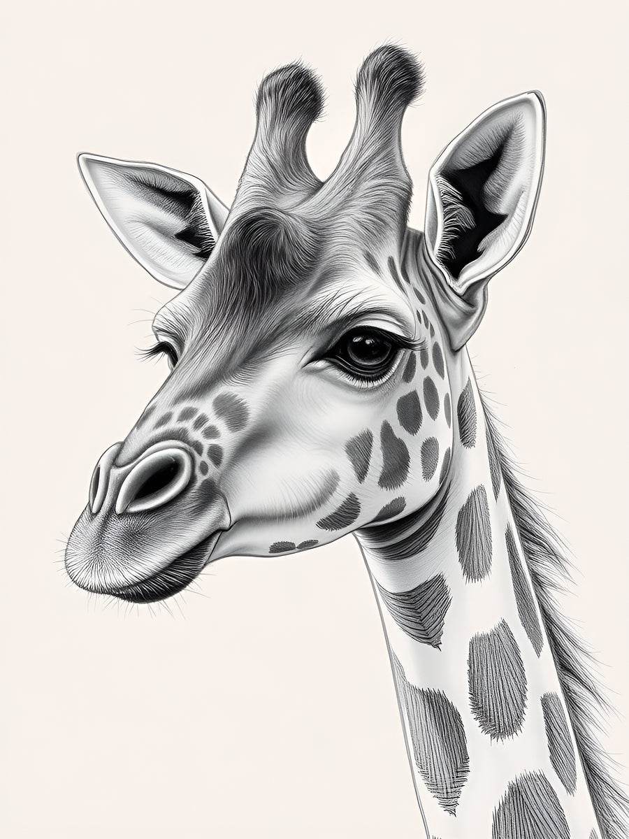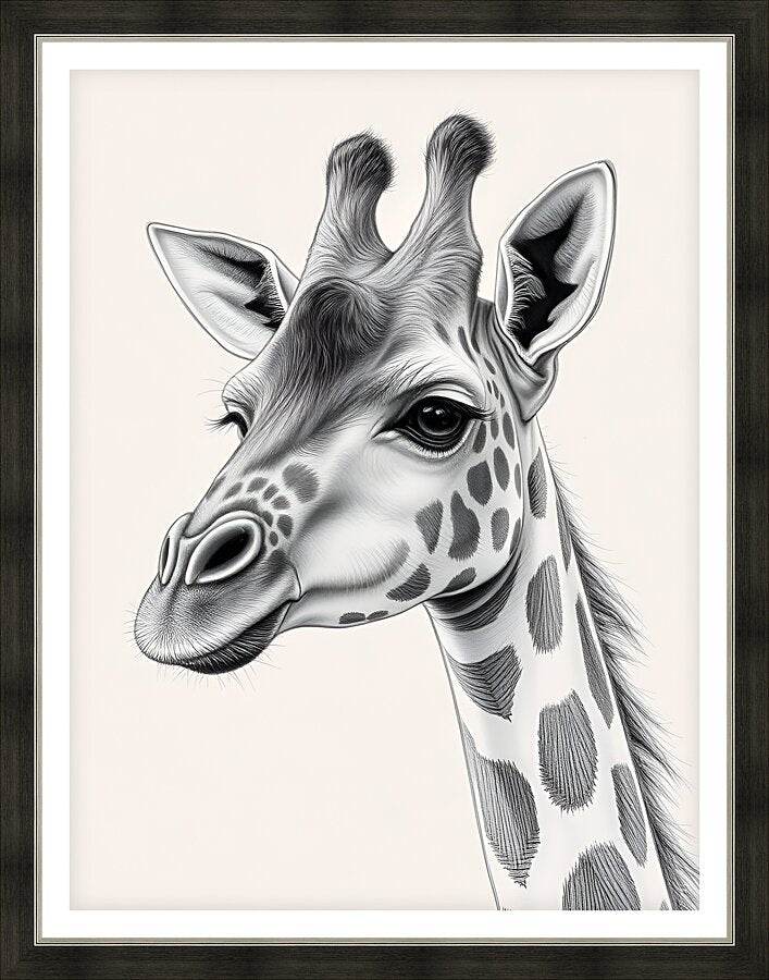 Enter a world of elegant simplicity with Wildlife Artwork 6 - Monochrome-Portrait-Elegant-Detailed. This sophisticated masterpiece captures the essence of wildlife grace through a stunning monochrome portrait of a beautiful giraffe featuring intricate pattern details. Delicate black and white tones with subtle grey shading create an elegant composition that speaks to the beauty of African wildlife and contemporary minimalist art with timeless appeal.